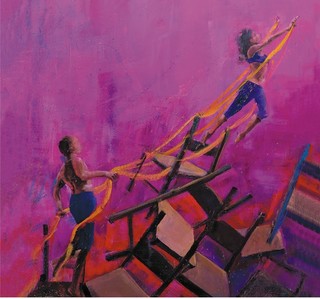 Commissioned by Realm directly from Twose, “Reach II” has layers of meaning for us. The vibrant color palette provides a visual tie to the previous label for The Tempest. The figures poised on haphazardly stacked chairs bring to mind the notions of balance and tension, ideas we constantly think about in winemaking. And the precariousness of the figures in this composition embodies one of Realm’s core values: dare greatly. As Twose says of the work: “This painting is one of a series that explores the idea of imbalance and risk, how we have to push ourselves into the unknown, even if the way there can feel frightening or unstable; otherwise, you stay where you are, safe but stuck.” We couldn’t have said it better.