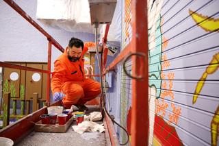 In January 2023 we asked Taki and his wife, Molly Kitamura, to paint the entrance to the caves at Realm’s Whiskey Hotel. Over three weeks, they transformed the utilitarian space into a phantasmagorical scene that blends Eastern and Western iconography with expansive undersea creatures, small oceanic life forms and whimsical flourishes throughout. It is truly a masterpiece.